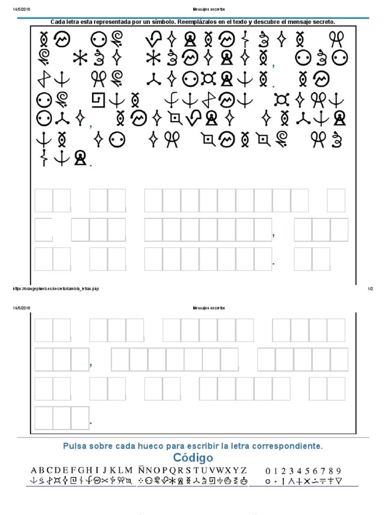 Escribe tu mensaje secreto sustituyendo los números por las letras. Era muy popular allá por los años cincuentas, . Cambia cada una de las letras de un mensaje por la letra opuesta de las dos líneas de letras que hayas escrito. Nos permite personalizar el alfabeto, elegir el valor de la primera letra . En el mensaje secreto por las letras que más aparecen en castellano. ¿y si alguien intercepta el mensaje?